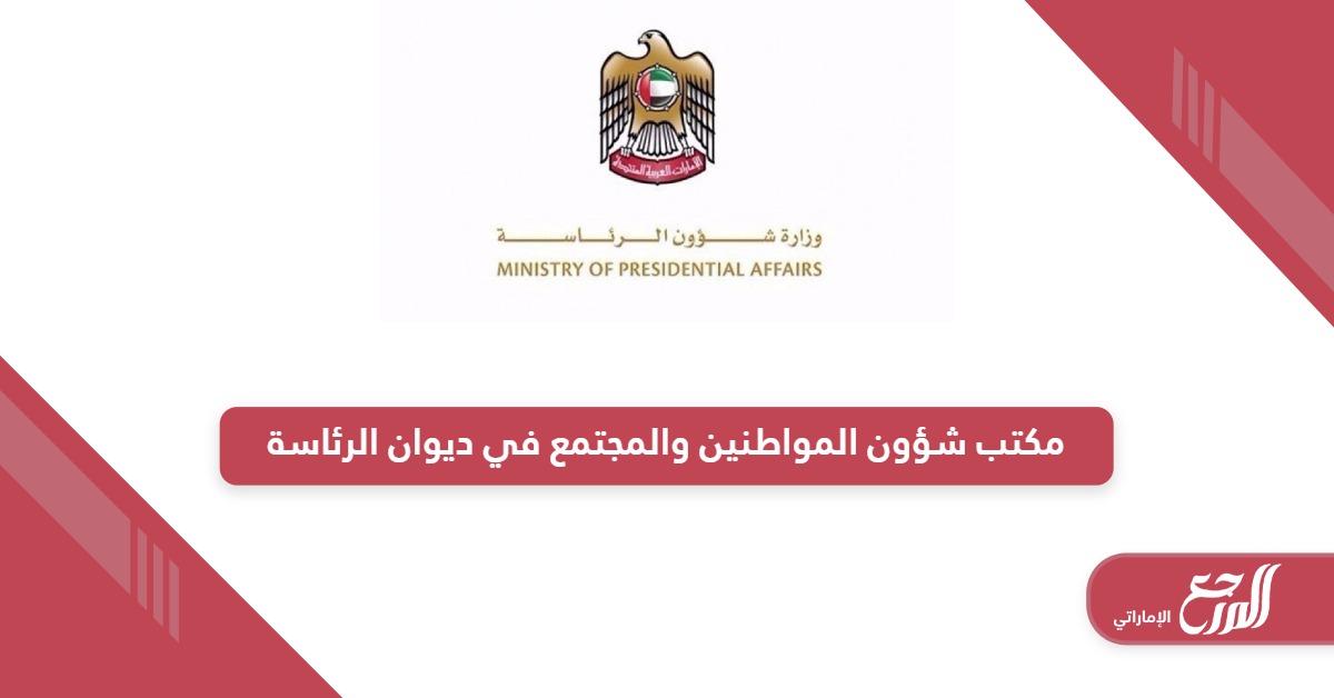 قام الشيخ محمد بن زايد آل نهيان حاكم دولة الإمارات العربية المتحدة في العام 2022 ميلادياً بإصدار المرسوم بقانون اتحادي رقم 2، والذي ينص على إنشاء مكتب شؤون المواطنين والمجتمع في ديوان الرئاسة، والذي يتمتع بالاستقلالية المادية والإدارية والأهلية القانونية للتصرف، ويتبع بشكل مباشر إلى الوزير في ديوان الرئاسة، وحدد هذا المرسوم المقر الرئيسي للمكتب في مدينة أبوظبي.